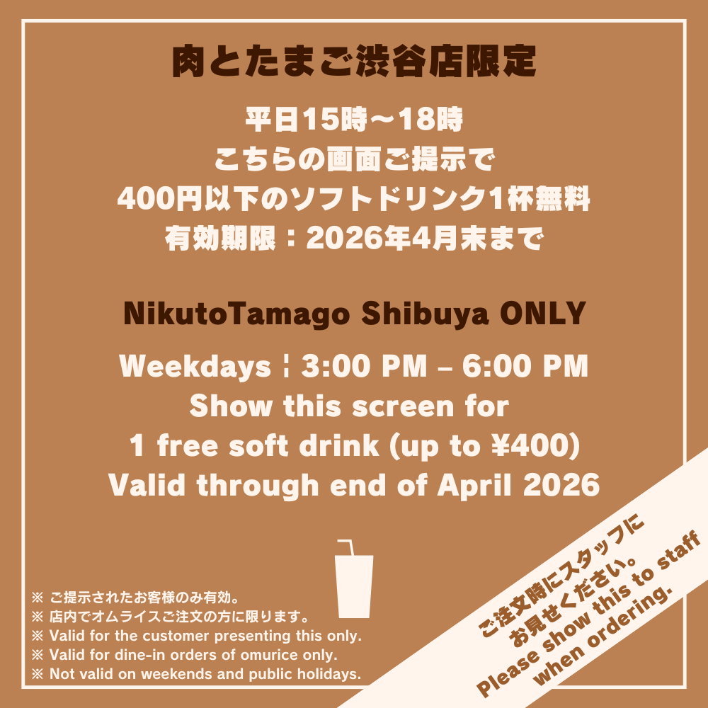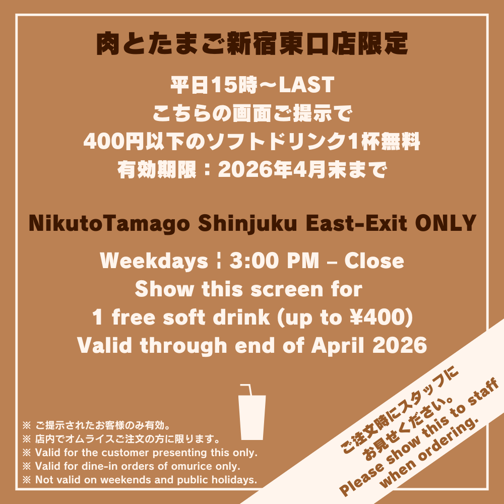 ご注文時にスタッフにクーポンをご提示し、ソフトドリンクをお伝えください。