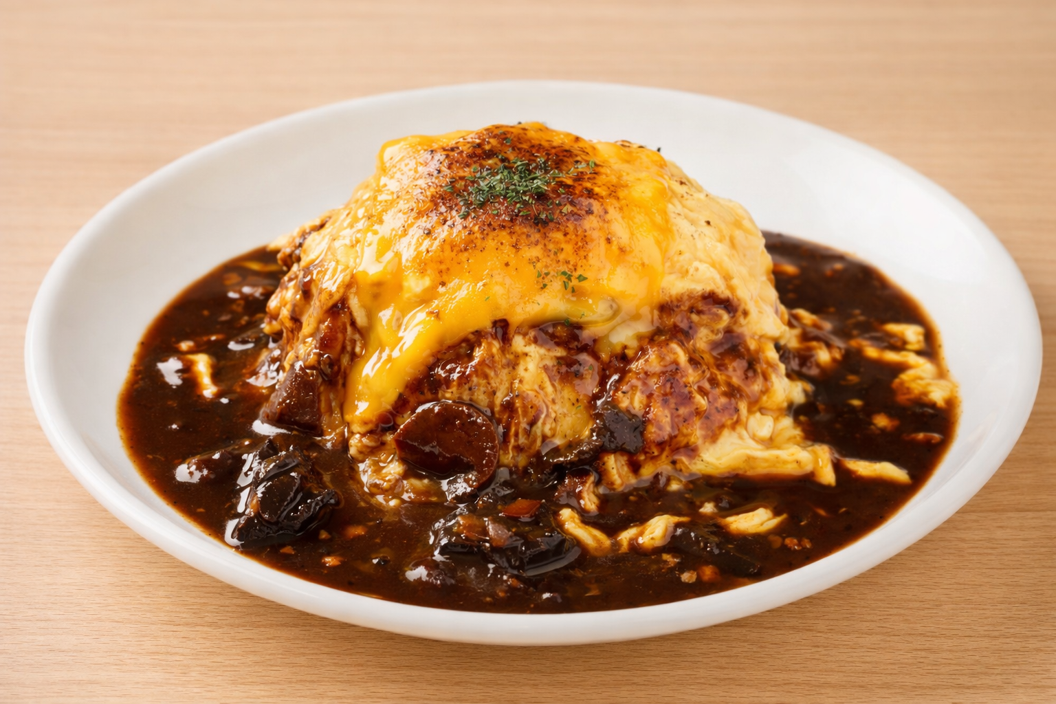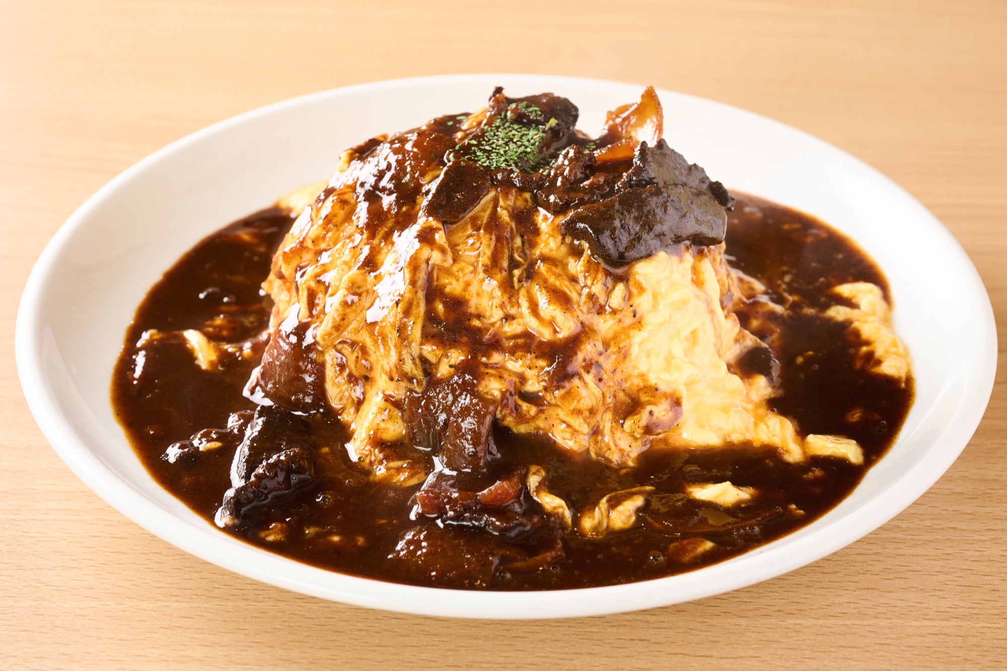 旨みたっぷりの自家製ステーキソースをふわとろオムライスにたっぷりとかけた一皿。香ばしくコク深い味わいが広がる、肉好きにもおすすめの満足感あるオムライスです。